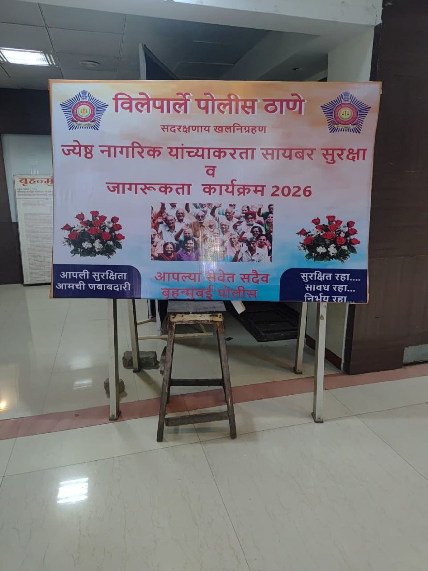 विलेपार्ले पोलीस ठाण्याच्या वतीने ज्येष्ठ नागरिकांसाठी सायबर सुरक्षा व जागरूकता कार्यक्रमाचे आयोजन दि. १३ एप्रिल २०२६ रोजी सायंकाळी ४.३० ते ७.३० या वेळेत दीनानाथ मंगेशकर नाट्यगृह, विलेपार्ले (पूर्व) येथे करण्यात आले.