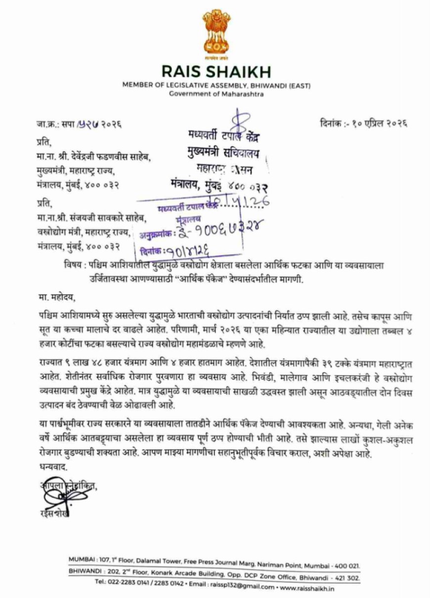 मुंबई : पश्चिम आशियामध्ये सुरू असलेल्या युद्धाचा मोठा फटका महाराष्ट्रातील वस्त्रोद्योगाला बसला असून, निर्यात पूर्णपणे ठप्प झाल्याने उद्योग गंभीर अडचणीत सापडला आहे. या पार्श्वभूमीवर समाजवादी पक्षाचे आमदार Raees Shaikh यांनी राज्य सरकारकडे विशेष आर्थिक पॅकेजची मागणी केली आहे.